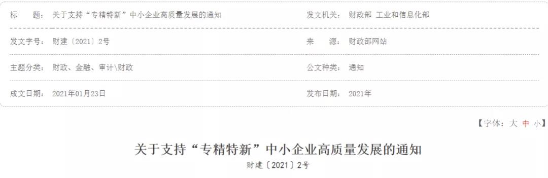 2021年1月23日,財政部、工業(yè)和信息化部聯(lián)合印發(fā)《關(guān)于支持“專精特新”中小企業(yè)高質(zhì)量發(fā)展的通知》,啟動中央財政支持“專精特新”中小企業(yè)高質(zhì)量發(fā)展政策。為讓企業(yè)對申報相關(guān)事宜有更深入的了解,現(xiàn)對各地申報認(rèn)定“專精特新”政策進(jìn)行匯總。