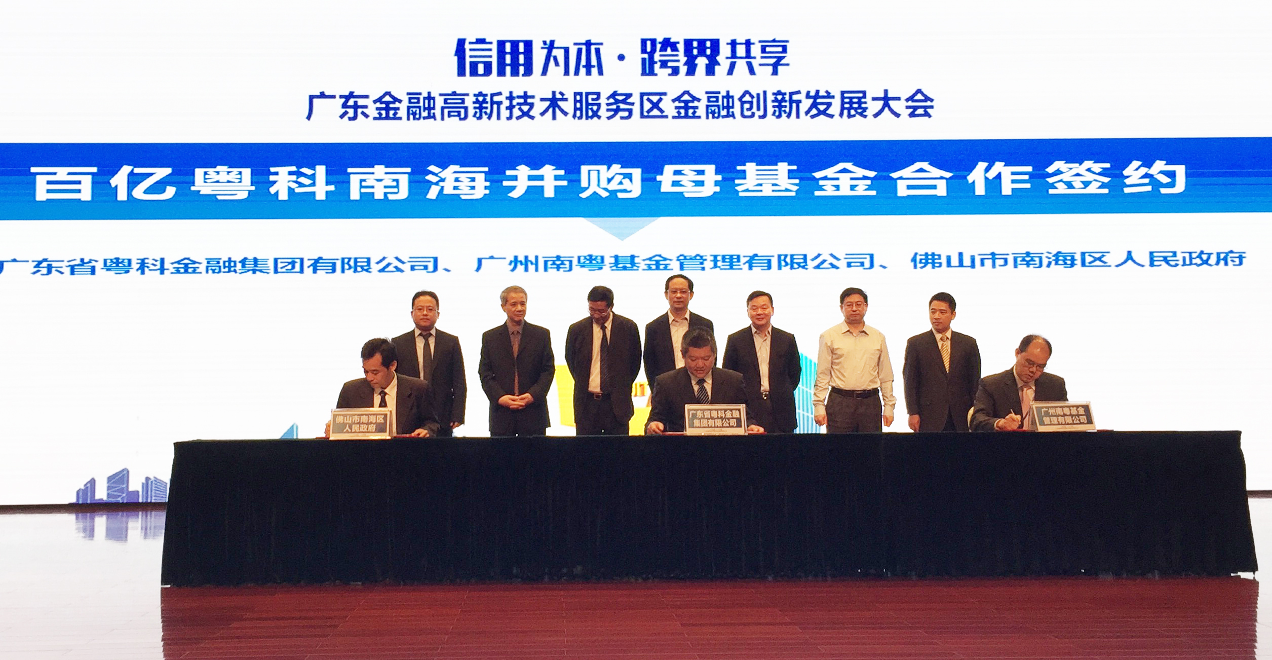 (見(jiàn)證嘉賓從左至右依次為南粵基金董事長(zhǎng)林濤、省金融辦副主任張曉山、省粵科集團(tuán)董事長(zhǎng)侯外林、人行廣州分行行長(zhǎng)王景武、佛山市市長(zhǎng)朱偉、省科技廳副廳長(zhǎng)楊軍、佛山市市委常委南海區(qū)委書記黃志豪,曾金賢總經(jīng)理代表南粵基金與粵科集團(tuán)、南海區(qū)政府簽署合作協(xié)議)