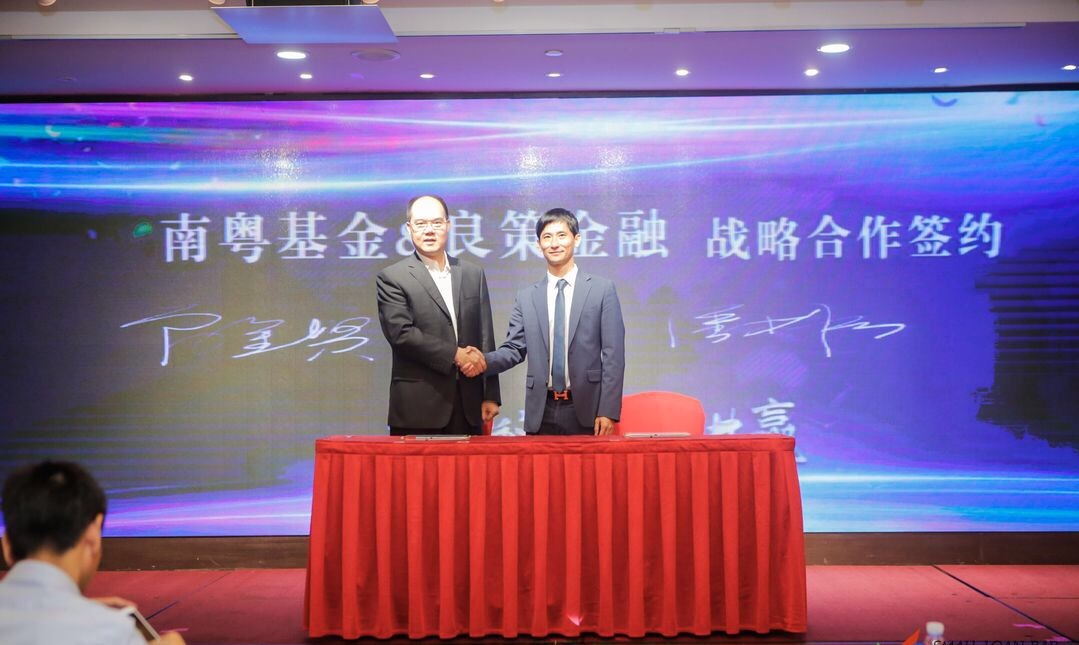 南粵基金集團(tuán)總裁曾金賢(左)與良策金融集團(tuán)董事長潘梓森(右)簽署戰(zhàn)略合作協(xié)議