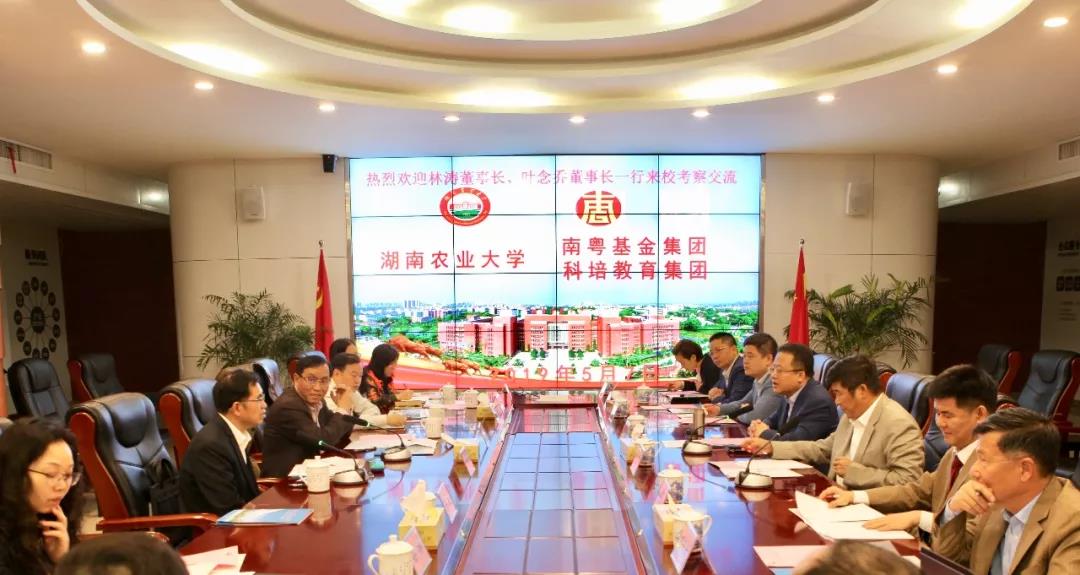 5月7日,廣州南粵基金集團有限公司(簡稱“南粵基金”)董事長林濤,中國科培教育集團董事會主席、廣東理工學院董事長葉念喬一行到訪湖南農業(yè)大學,與中國工程院院士、湖南農業(yè)大學黨委副書記、校長鄒學校舉行座談,雙方就合作辦學事宜開展深入交流并達成重要共識。會談結束后,湖南農業(yè)大學黨委書記陳弘與林濤董事長一行進行了親切交流。