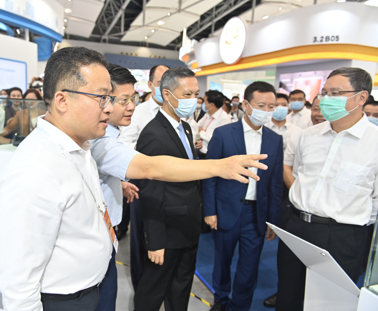張碩輔書記(左三)、張新副省長(左四)、陳志英常務(wù)副市長(左五)在南粵基金展廳視察