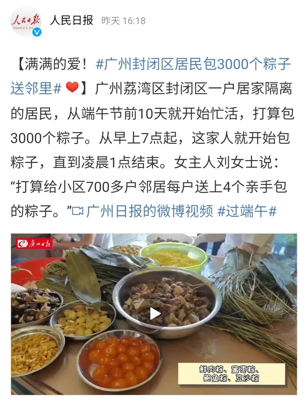 端午佳節(jié),因新冠疫情,廣州不少地方正處于封閉狀態(tài),在廣州本輪疫情感染者逐漸減少,風(fēng)險范圍日趨局限的當(dāng)下,疫情封控區(qū)市民吃上一口熱氣騰騰的粽子,過個特殊卻溫馨的端午節(jié),對于提振市民的信心頗為重要。