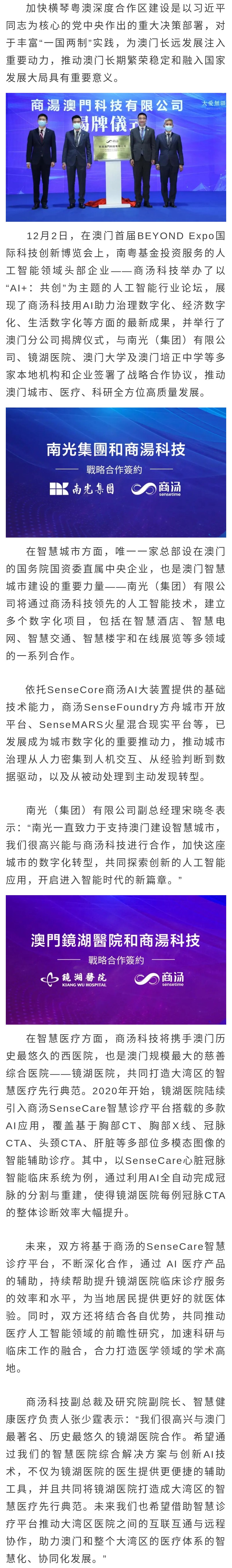 南粵基金投資企業(yè)商湯科技“落戶”澳門 助力粵澳深度合作高質(zhì)量發(fā)展