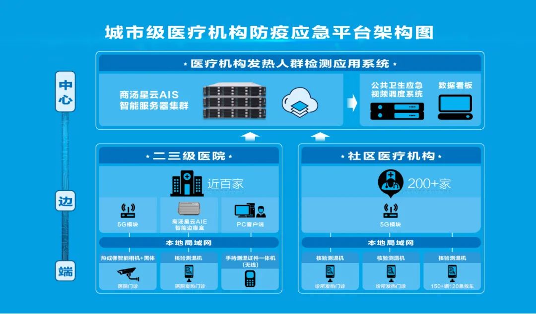 憑借SenseCore商湯AI大裝置的算法和算力支持,以及在智慧城市場景長期技術(shù)積淀和實踐經(jīng)驗,商湯構(gòu)建了集AI算法和算力、云計算、5G技術(shù)于一體的“云-邊-端”融合的體系架構(gòu),可有效滿足大客流人體測溫篩查和疫情實時大數(shù)據(jù)報告的需求。