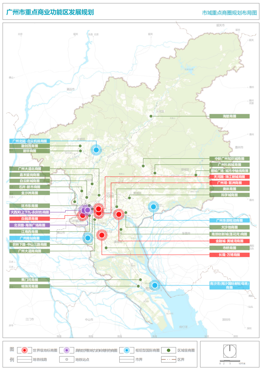 其中,5個世界級地標商圈包括天河路-珠江新城商圈、廣州塔-琶洲商圈、金融城-黃埔灣商圈、長隆-萬博商圈以及白鵝潭商圈;2個具有世界影響力的嶺南特色商圈包括北京路-海珠廣場商圈、大西關(guān)(上下九-永慶坊) 商圈;4個樞紐型國際商圈包括廣州北站-白云機場商圈、廣州南站商圈、廣州東部樞紐商圈、南沙灣(南沙國際郵輪母港) 商圈。