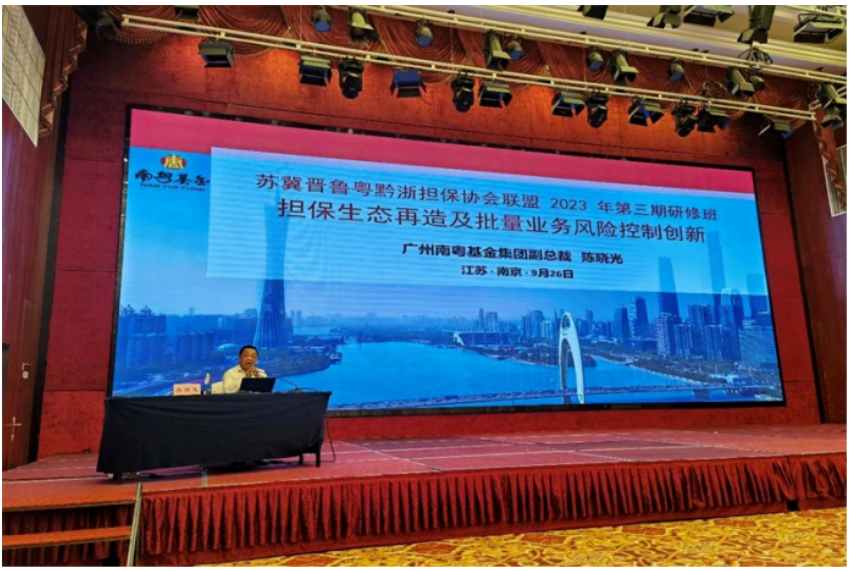 近日,由江蘇省信用擔(dān)保協(xié)會主辦的蘇冀晉魯粵黔浙七省擔(dān)保協(xié)會聯(lián)盟2023年第三期研修班在江蘇南京成功舉辦,南粵基金集團(tuán)副總裁、南粵國投董事長陳曉光作為特邀嘉賓出席活動并作主題演講。來自江蘇、河北、山西、山東、廣東、貴州、浙江以及安徽、青海和新疆等10個省份200多家擔(dān)保機(jī)構(gòu)近300人參加此次培訓(xùn)。