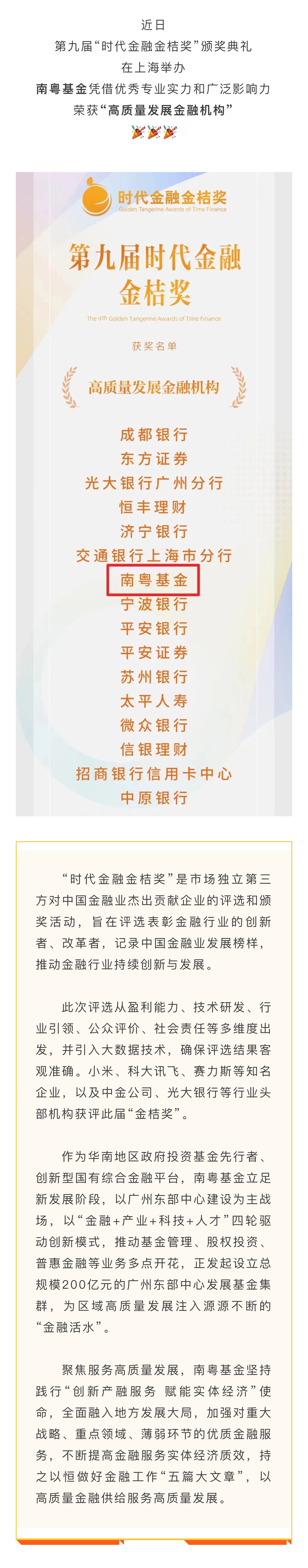 時代“金桔獎”揭曉 南粵基金榮獲“高質(zhì)量發(fā)展金融機構(gòu)”