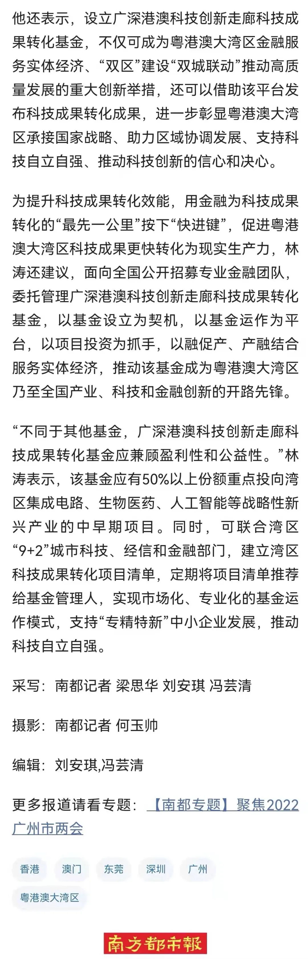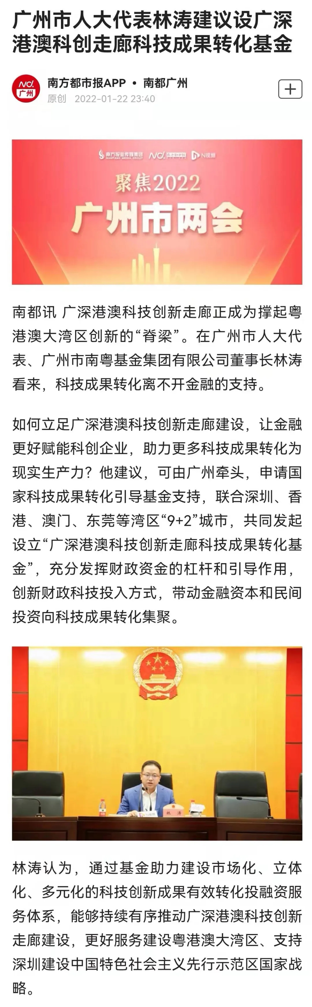 聚焦兩會(huì)|《南方都市報(bào)》:林濤代表建議設(shè)廣深港澳科創(chuàng)走廊科技成果轉(zhuǎn)化基金