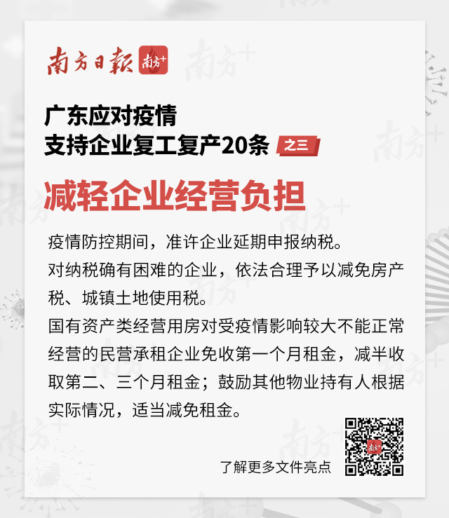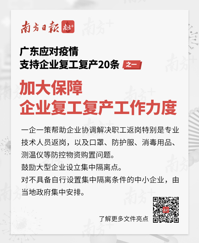 2月6日下午,廣東省政府正式印發(fā)《關于應對新型冠狀病毒感染的肺炎疫情支持企業(yè)復工復產的若干政策措施》,從進一步加大保障企業(yè)復工復產工作力度、降低企業(yè)用工成本、減輕企業(yè)經營負擔、加大財政金融支持、優(yōu)化政府服務等關鍵環(huán)節(jié),提出了5方面共20項政策措施,全力支持和推動受疫情影響的各類企業(yè)復工復產。五圖輕松讀懂>>>