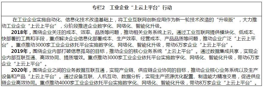 3.推動企業(yè)“上云上平臺”。支持企業(yè)“上云上平臺”,通過按需付費(fèi)的模式,使用平臺通用信息技術(shù)基礎(chǔ)設(shè)施和業(yè)務(wù)系統(tǒng),降低信息化一次性投入成本,快速提升信息化水平。支持工業(yè)企業(yè)“上云上平臺”,圍繞企業(yè)生產(chǎn)管理關(guān)鍵環(huán)節(jié),運(yùn)用工業(yè)互聯(lián)網(wǎng)新技術(shù)新模式實(shí)施數(shù)字化網(wǎng)絡(luò)化智能化升級,進(jìn)一步降本提質(zhì)增效。(省經(jīng)濟(jì)和信息化委、通信管理局,各地級以上市人民政府)